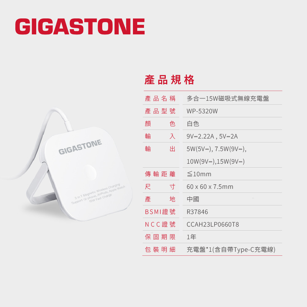 GIGASTONE 15W MagSafe 三合一磁吸無線充電盤 WP-5320W|適用 iPhone/MagSafe/Apple Watch/耳機手機