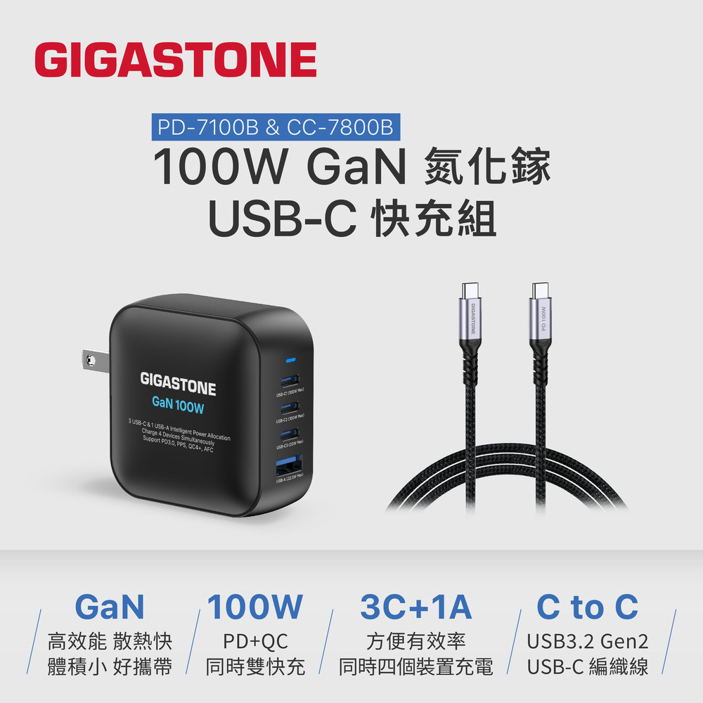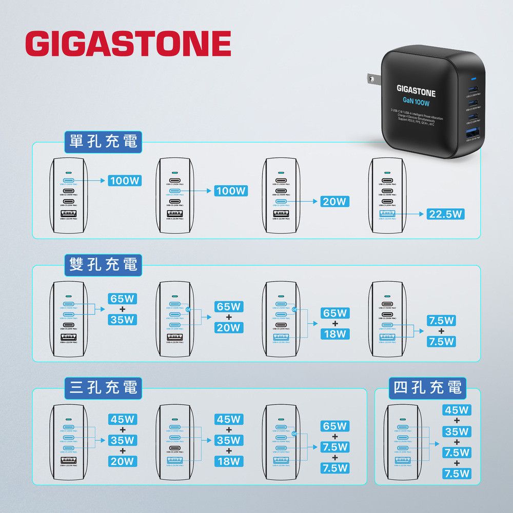 2. 最高輸出 100W,智能瓦數分配,支援 4 個裝置、2 台筆電同時充電