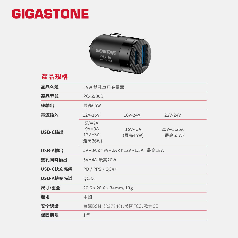 GIGASTONE 65W 二入組 超小型 雙孔車用充電器 PC-6500B|適用iPhone/三星手機/iPad/TypeC PD快充